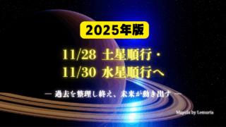 ― 過去を整理し終え、未来が動き出す ―序章11月下旬、重たい天体のひとつ 土星が28日に順行 へ。続いて 30日に水星が順行 に戻ります。この2つの順行は、10月から続いてきた「内省・修正・再調整」の流れを完了させる、✨ “本格的な再スタ...