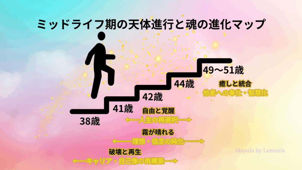 | 38〜45歳頃 | 冥王星スクエア | 価値観や生き方の根底が崩れ、再生が起こる。 |