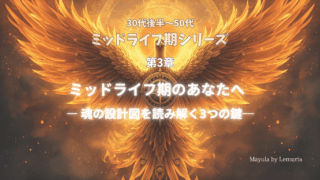 3.ミッドライフの通過儀礼 第3章:ミッドライフ期のあなたへ ― 魂の設計図を読み解く3つの鍵 ― 太陽・月・ドラゴンヘッド ―自分を知ることは、“魂の音”を思い出すこと魂の設計図(出生チャート)は、あなたがこの人生でどんな音色を奏でようとしているのかを示しています。その中でも、特に 魂の再誕のタイミング(ミッドライフ期)に響き始める... 2025.12.01 3.ミッドライフの通過儀礼ミッドライフ期シリーズ